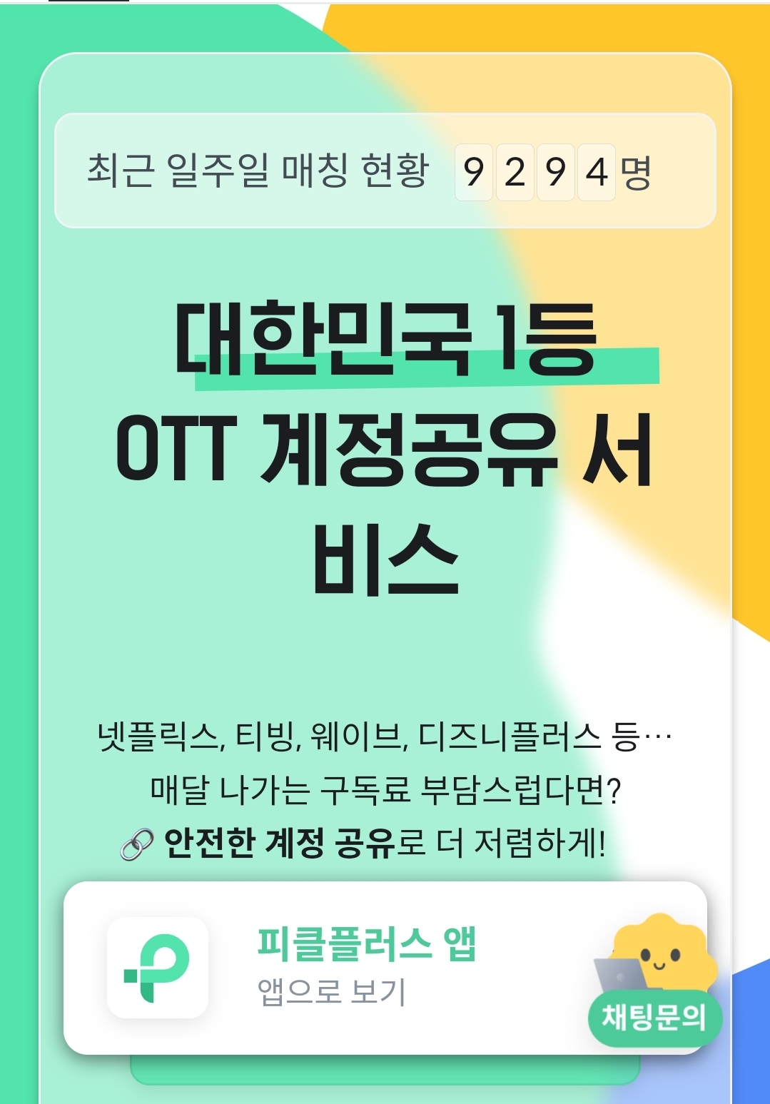 넷플릭스 디즈니플러스 티빙등 OTT서비스를 한 번쯤은 이용해 보셨을 텐데요 너무 비싸진 금액때문에 OTT 서비스를 해지하시는 분들도 많이 있습니다. 넷플릭스의 경우 17000원의 이용요금을 지불하고 봐야하는 부담스러운 금액인데요 하지만 4000원대로 저렴하게 보는 방법이 있습니다. 바로 OTT 공유 플랫폼인 피클플러스 입니다.