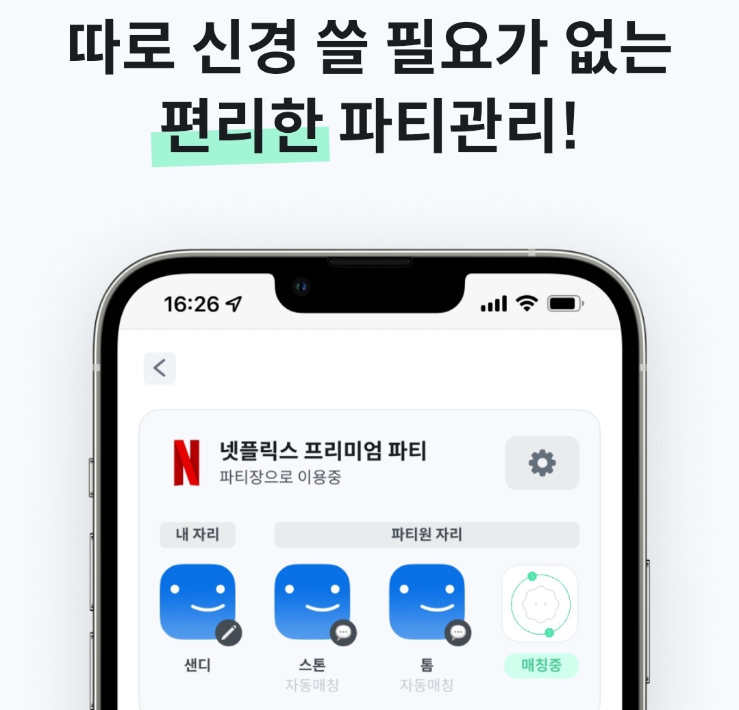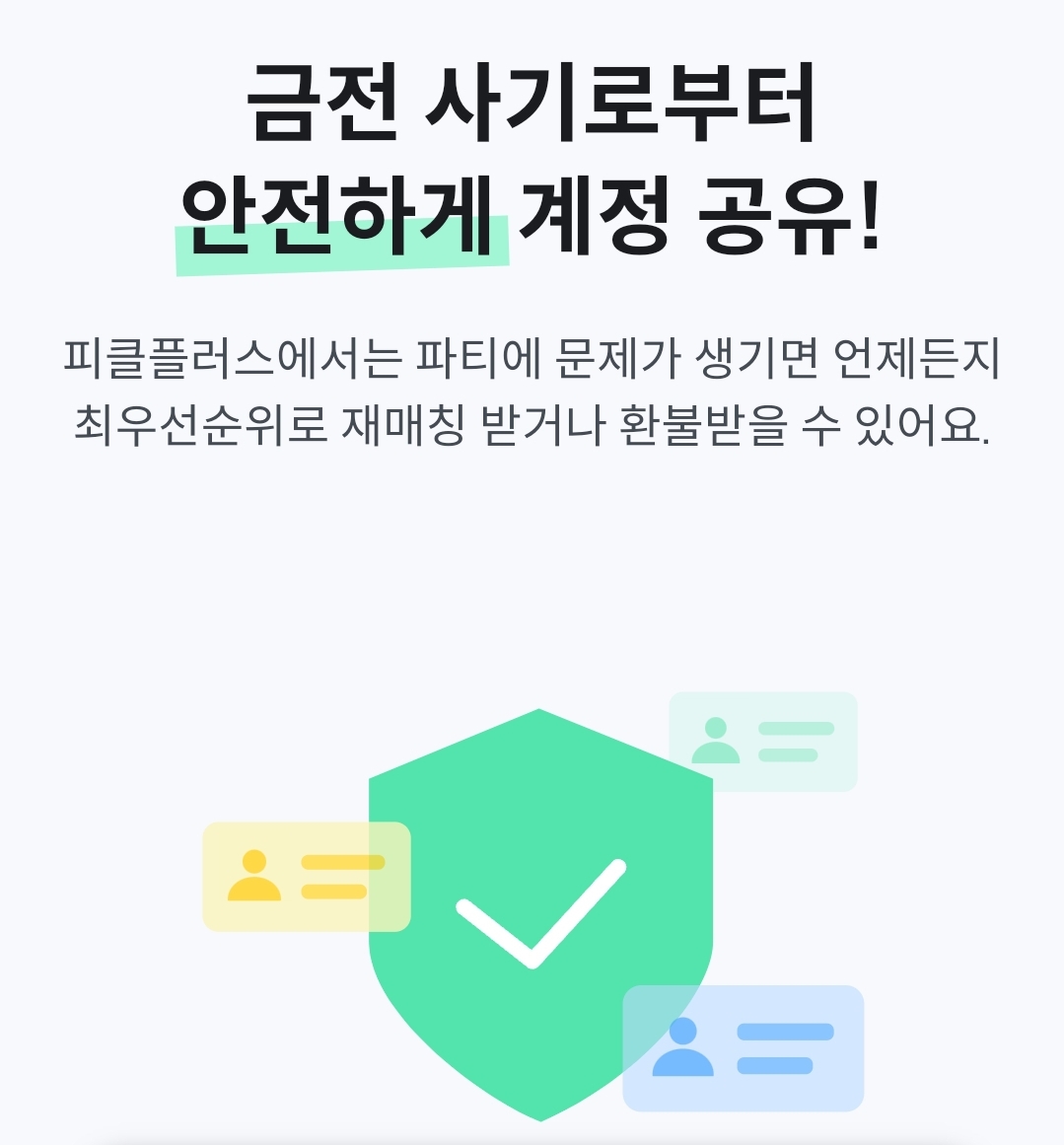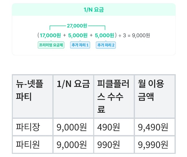 파티장은 계정 주인을 말하고 계정을 공유하는 사람을 파티원이라고 합니다. 선택 가능하고 피클플러스를 통해 파티장이 파티원에 매칭이 성사되면 중개역할을 한 피클플러스에게 중개료 파티장 440원, 파티원 990원을 지불합니다.